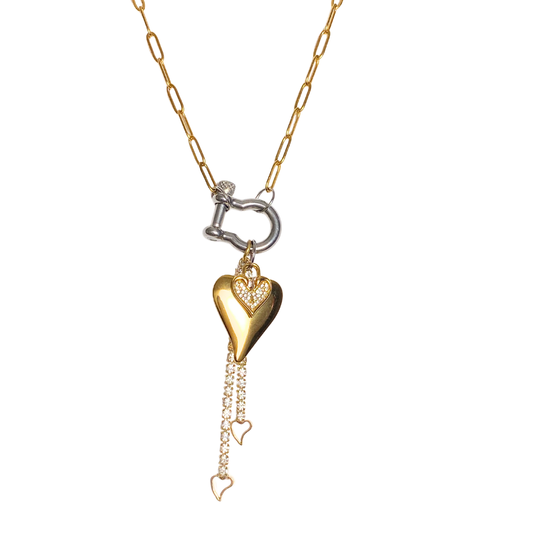 Radiant heart gold and silver charms and gold paper clip chain necklace